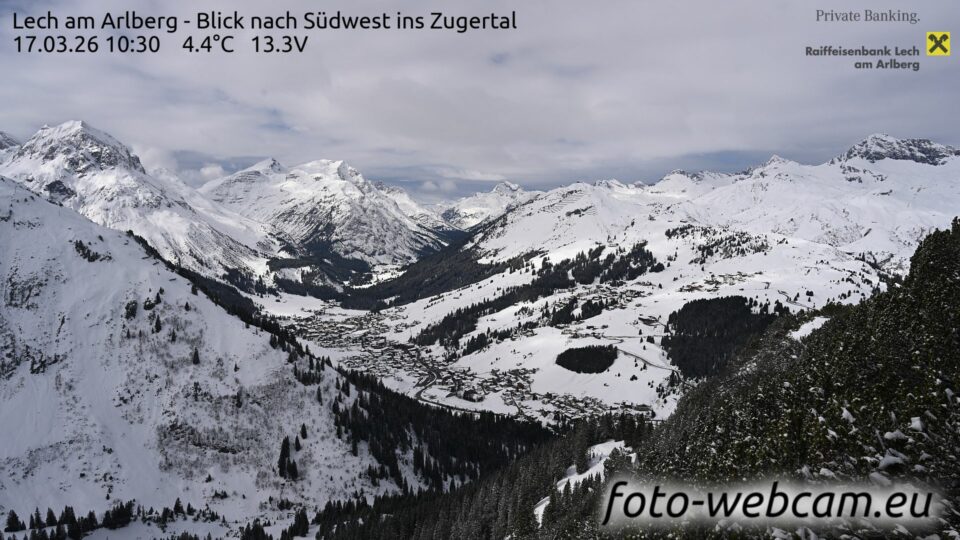 Gemeinde Lech: Pension Bergland is a still webcam view for Gemeinde Lech, Vorarlberg, Austria. More information is available on the source page: https://www.foto-webcam.eu/webcam/oberlech/.