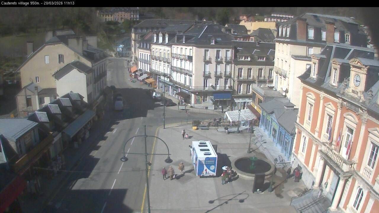 Cauterets: Place de la Mairie is a video webcam view for Cauterets, Occitania, France. More information is available on the source page: https://www.skaping.com/cauterets/village.